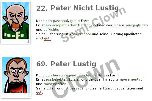 | Clowns und Semi-Clowns haben keinen besonderen Preis oder Wert auf dem Transfermarkt, sie werden einfach nach ihren Skills bezahlt wie jeder andere nicht-Clown auch. Clowns müssen nur im Kader sein um zu wirken, sie müssen also nicht in den Spielen eingesetzt werden. Damit ein Clown wirkt (also der Leitwolf im Team ist), muss er die höchste Führungsqualität im Team haben (der Trainer zählt hier nicht mit). | |