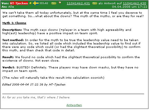 Ist ein Spieler mit guter Führungsqualität "beliebt", so nennt man ihn einen Clown, es ist die maximale Beliebtheitsstufe, die auf diese Weise dem Team zugetragen werden kann. Wenn ein Spieler mit guten Führungsqualitäten "symphatisch" ist, so sprechen einige von einem Semi-Clown.