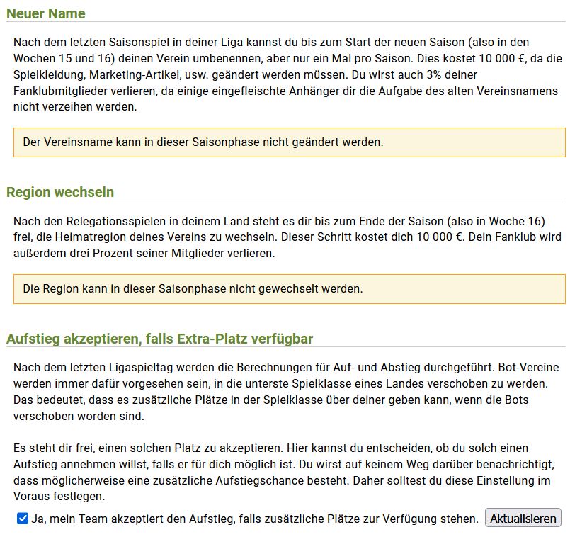 Hier kannst Du in der Saisonpause Deinen Vereinsnamen und Deine Region wechseln. Kostenpunkt jeweils 10.000 € und 3 % der Fans werden Deinen Verein verlassen.