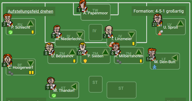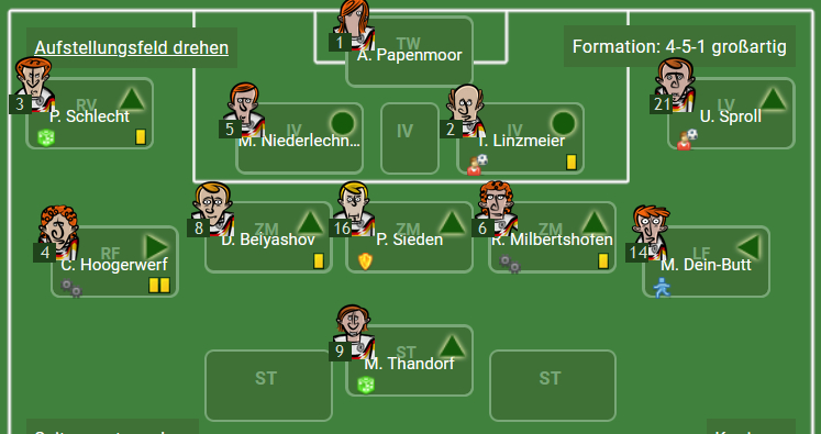 - „Schnelle“ und „kopfballstarke“ Stürmer und Flügelspieler sind anderen Spielern vorzuziehen. Hat der Gegner in der Abwehr oder im inneren Mittelfeld „kopfballstarke“ Spieler, so sind „Ballzauberer“ auch gern gesehen.