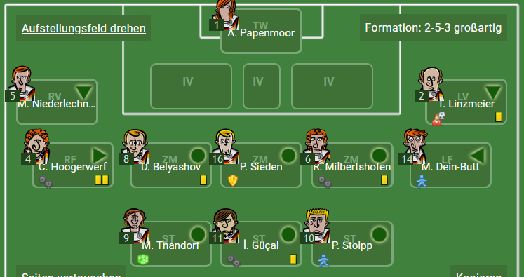 Vorab zur Veranschaulichung eine mögliche Variante der Schweinetaktik im 2-5-3. Beachte, dass der/die "offensive(n)" Verteidiger und die Flügel "zur Mitte" idR "echte" Mittelfeldspieler sind, sie haben also vor allem "Spielaufbau" und "Kondition". In den Artikeln unten, die schon sehr alt sind, wird die 2-5-3-Formation nicht erwähnt, da sie damals noch nicht einspielbar war. In der linken Variante sind beide Außenverteidiger offensiv, diese sollten auch durchaus "Flügelspiel" haben, um den Angriff zu stärken. In der rechten Variante sind zwei offensive Innenverteidiger am Start, hier ist das Ziel mit möglichst viel "Spielaufbau" das Mittelfeld zu stärken. Man könnte zusätzlich auch noch die Stürmer "devensiv" setzen (Stärkung Mittelfeld durch "Spielaufbau" bei gleichzeitiger Schwächung des Angriffs.