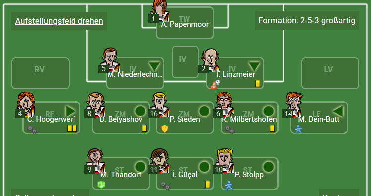 Die Varianten mit defensiven Stürmern lasse ich bewusst außen vor, da es nur sehr wenige dafür passende Stürmer gibt oder aber gegen den Grundsatz - starker Sturm - verstoßen wird. Es wird mit dieser Aufstellung versucht 2 überlegene Mannschaftsteile zu bekommen, denn in aller Regel gewinnt die Mannschaft die 2 der 3 Mannschaftsteile dominiert. (Es gilt allgemein die Aufstellungen dahin gehend zu optimieren, dass man zwei von drei Mannschaftsteilen gewinnt, unabhängig von der Schweinetaktik)