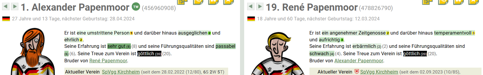 Hier ein Beispiel eines Brüderpaars ohne Spezialfähigkeit aus meinem Kader, Screenshot vom Januar 2024: