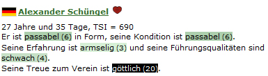 Eigengewächse: Spieler, die noch nie in einem anderen Verein als in Deinem gespielt haben, bekommen einen "Heimatvereinbonus" in Höhe von 0,5 Skillstufen (Ausnahme: Kondition). Gekennzeichnet werden diese Spieler mit einem Herz neben ihrem Namen: