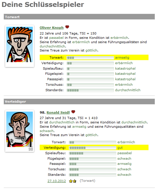 Im Bereich "Spieler" findest Du rechts einen Link zu den "Schlüsselspielern". Hattrick listet hier die jeweils stärksten Spieler pro Position auf, es wird jedoch immer nur der wichtigste Skill (A-Skill) berücksichtigt und gelb unterlegt. Haben mehrere Spieler den gleichen A-Skill, so ist wohl der Spieler der Schlüsselspieler, dessen Vornamen im Alphabet am weitesten vorne zu finden ist, bei Supportern wird in diesem Fall anscheinend zuerst nach der Rückennummer sortiert. Man erkennt also: Für Einsteiger ganz nett, um direkt die stärksten Spieler zu erkennen, aber irgendwie auch nicht so wirklich der Knaller... Hier ein Beispiel typischer Schlüsselspieler eines neuen Teams: ![]()