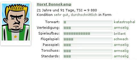 ( (Mittelfeld, Chance auf Negativ-SEs des Gegners) bzw. Torschuss ( (alle 3 Angriffsseiten) immer: Passspiel (ist der Spieler Ballzauberer mit einem Bonus, daher kann man hier Passpiel durchaus als A-Skill ( (alle 3 Angriffsseiten) Flügelspiel ( (linke und rechte Angriffsseite) Kondition ( (Verhindern von Leistungsabfall) |
