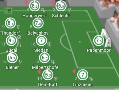 Nach den Matches kannst Du im Bereich "Spiele" Dein Spiel anklicken und oben auf den "Stern" klicken. Dort siehst Du die durchschnittliche Sternchen-Bewertung Deiner Spieler und ihren konditionellen Zustand. Kollege Bleher steht hier beispielweise am Ende des Spiels auf "79 % Kondition":