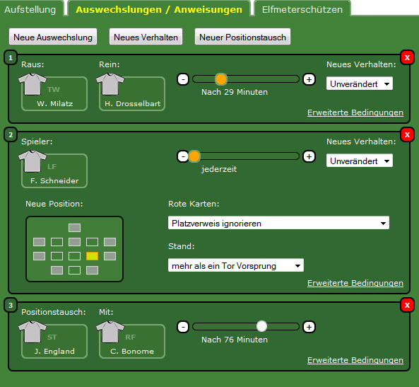 Du kannst bei der Aufstellung zu Deinen Spielen vor dem Match bis zu 5 spezielle Anweisungen an Deine Spieler geben. Dabei kannst Du neben dem Zeitpunkt oder einem evtl. Spielstand wählen, ob Du Spieler auswechseln möchtest (maximal 3) und / oder Spieler eine andere Ausrichtung / Position geben willst.