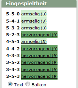 Dein Gegner kann Deine Einstellung (PIN/PIC/MOTS) nicht erkennen, dafür kannst Du auch nicht sehen, wie Dein Gegner gespielt hat. Daher gilt es also, das Mittelfeld Deiner Gegner genau unter die Lupe zu nehmen, um evtl. PIC/MOTS-Spiele vom Gegner zu erkennen. Beachte dabei auch den eben erwähnten Heimvorteil. | ||||||||||||||||||||||||||||||||||||||||||||||||||||||||||||||