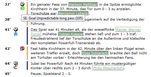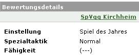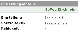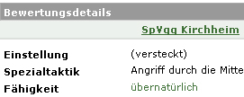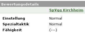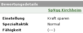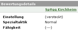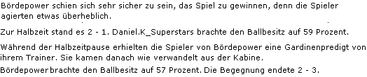 ) und die Unterschätzung wird in der 2. Halbzeit keine Rolle mehr spielen - Deine Spieler sind dann also endlich in "Normalform". Sollte Dein Team zur Halbzeit mit einem Tor in Führung liegen (Reduktion der Unterschätzung um 1/3) oder es Unentschieden stehen (Reduktion der Unterschätzung um 2/3), so wird Deine Mannschaft leicht verbessert auftreten. So sieht das dann im Spielbericht aus: