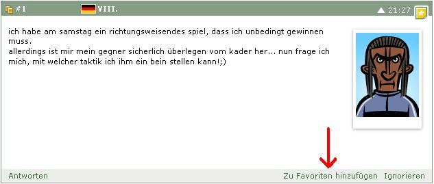 Wie finde ich raus, was mein Gegner im Spiel gegen mich plant - wie kann ich meinen Gegner ausspionieren? Vielleicht ist er ja so nett und fragt im Fragen-Forum andere User, wie er aufstellen kann. Und nun kommst Du ins Spiel: Als Supporter kannst Du nämlich Foren-User bookmarken: Dazu musst Du nur ein Posting von ihnen finden und unten rechts "Zu Favoriten hinzufügen" drücken: