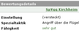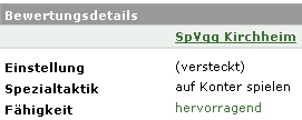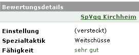 Bei der Auswahl des richtigen Spielsystems spielt neben den Ratings des Gegners auch das eigene Training eine Rolle. Die Bemerkungen "starke Abwehr", "schwacher Sturm" usw. hängen natürlich stark von den Fähigkeiten der eigenen Spieler ab, ich gehe hier bei meiner Einschätzung von einem ausgeglichenen Kader ohne einen überragenden Mannschaftsteil aus.