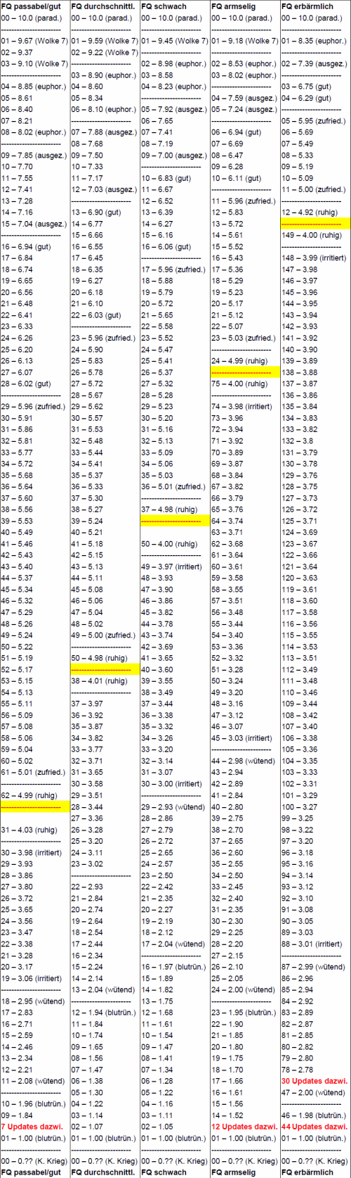 | Die Teamstimmung tendiert immer gegen "ruhig". Sie wird bei jedem täglichen Update, nach Transfers mit "Negativ-Meldung" im Bereich "Der Verein" und nach Pflichtspielen mit PIC/MOTS aktualisiert. Mit einem führungsstarken Trainer kann man diese Bewegung Richtung "ruhig" verlangsamen (bei einer Stimmung größer "ruhig") bzw. beschleuningen (bei einer Stimmung kleiner "ruhig"). Eine Erhöhung der Teamstimmung ist nur durch "PIC" oder durch das Senken der Trainingsintensität (nicht zu empfehlen -> starke Formeinbrüche, siehe nächster Punkt) möglich. MOTS, Heraufsetzen der Trainingsintensität und/oder Spieler (Ver-)Käufe (mit negativer Meldung im Bereich "Mein Verein, Manager") senken die Teamstimmung. Je höher die Teamstimmung, desto besser das Mittelfeldrating (ca. 7% Mittelfeld pro Stufe Teamstimmung, siehe Mittelfeldrechner). PIC mit "ausgezeichneter" Stimmung bringt ein leicht besseres Mittelfeldrating als "normal" mit "ruhiger" Stimmung. Hier gibt es eine Übersicht, wie sich die Teamstimmung um Laufe der Woche in Abhängigkeit zur Führungsqualität des Trainers verändert. | |||||||||||||||||||||||||||||||||||||||||||||||||||||||||||||||