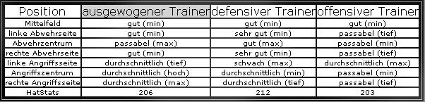 An den Werten in der Tabelle sieht man, dass man für optimale Boni durch den Trainer immer seinen besten Mannschaftsteil durch die Trainerausrichtung stärken sollte. |