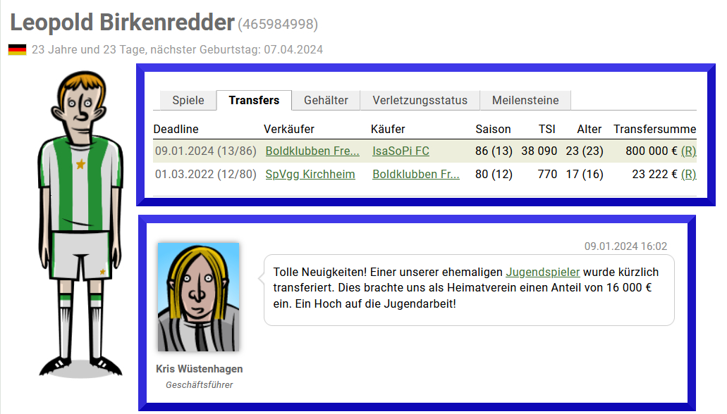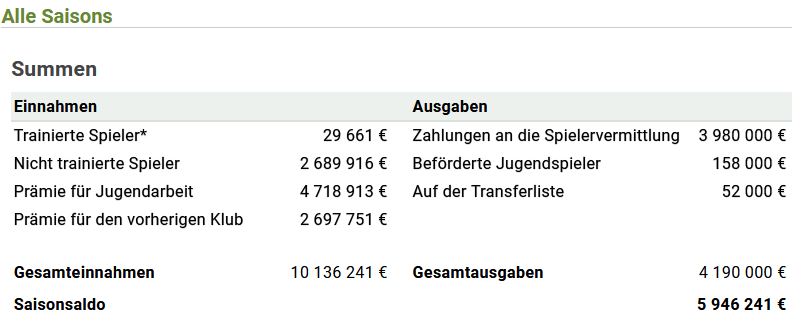 - Ist der Spieler aus der eigenen Jugend oder aus der Anfangsmannschaft, so bekommt man bei jedem Transfer (Vereinswechsel) bis an das Karriere-Ende des Spielers 2 % der Transfersumme in Form einer Jugendprämie. Verkaufst Du einen Spieler aus Deiner Jugend oder Anfangsmannschaft, bekommst Du fix 95 % der Transfersumme. Hier ein Beispiel für eine Jugendprämie: