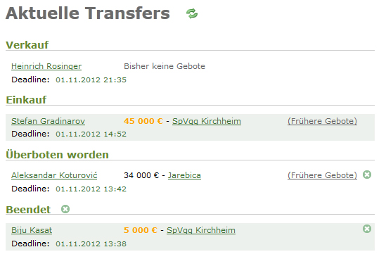 Die Deadline verletzter Spieler sollte man genau so setzen, dass sie während eines Spieles in Deinem Land (siehe tägliche Updates) liegt. Dann kann der Käufer auf den ersten Blick die Verletzung nicht erkennen. Das ist zwar moralisch gesehen gemein, aber es ist erlaubt... Außerdem kannst Du auch auf eigene Spieler bieten (z. B. wenn Du sie versehentlich auf die Transferliste gestellt hast oder wenn Du den Preis nach oben treiben willst). Erhältst Du den Zuschlag, dann bleibt der Spieler bei Dir - Du musst allerdings die Transfergebühren bezahlen.