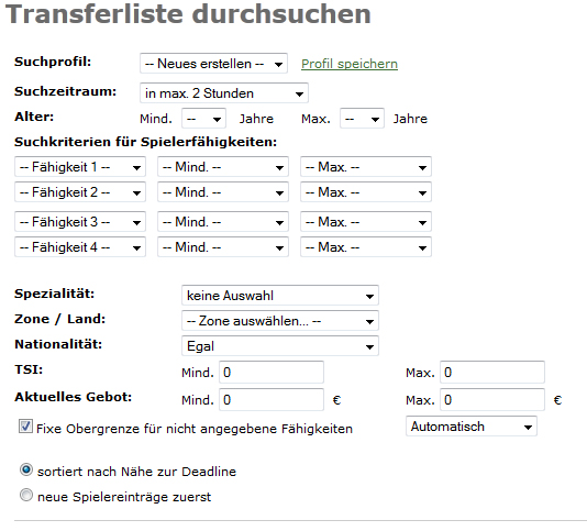 Die Unterpunkte erklären sich eigentlich von selbst, die zwei geschwungenen Pfeile oben in der Mitte laden diese Seite neu, damit man kein Gebot übersehen kann ;-) Ganz rechts geht's auf den tatsächlichen Transfermarkt zum Kauf von Spielern. In der Suchmaske gibt es viele verschiedene Auswahlmöglichkeiten, mit ein wenig Übung findest Du potentielle "Traumspieler" ziemlich schnell: