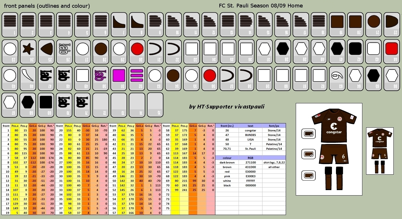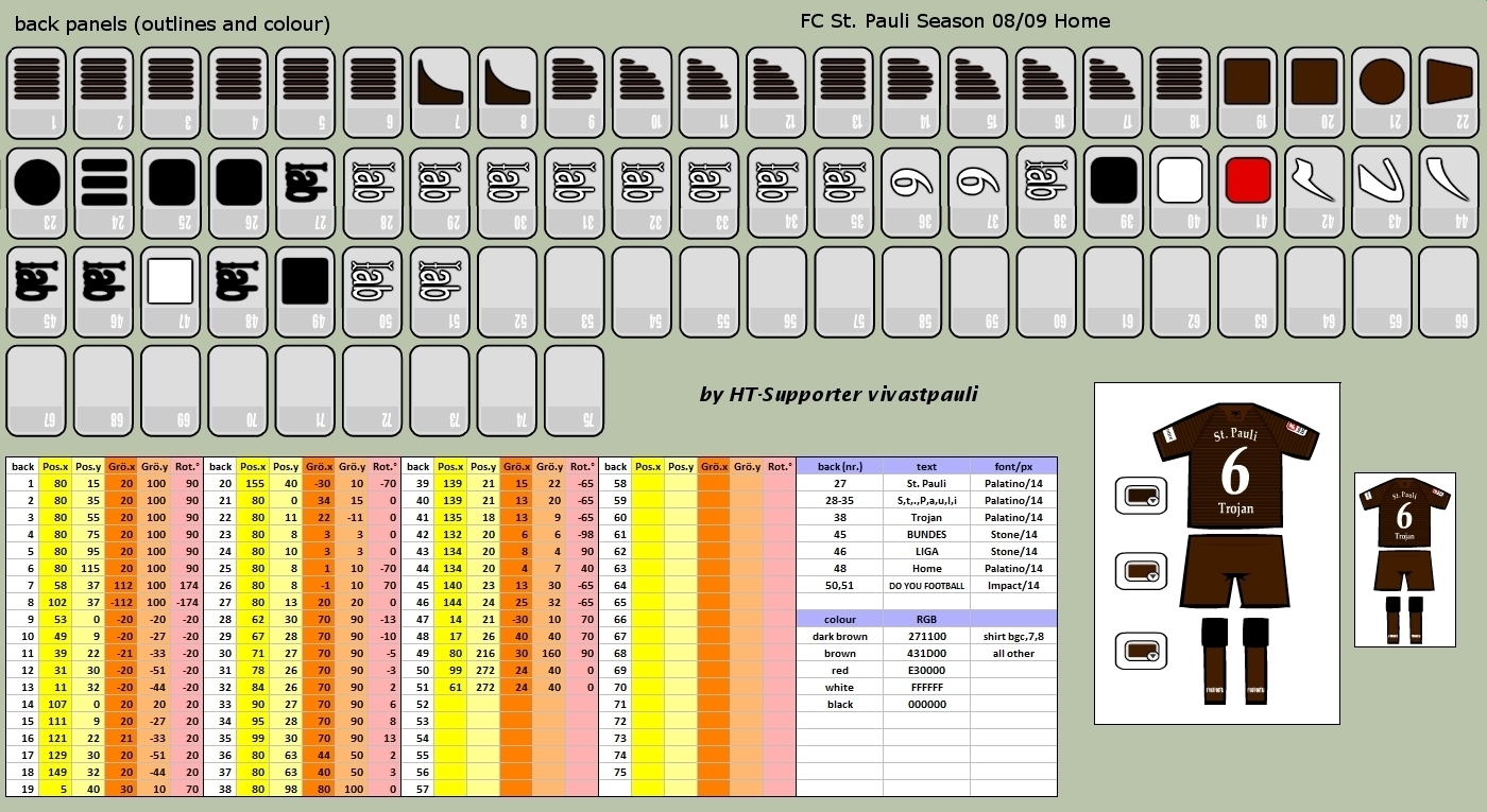 vivastpauli (FC Moorweide United (1198809)) von der Föderation "Trikot und Dress-Designer (78995)" hat www.ht-links.de eine Beispielanleitung netterweise zur Verfügung gestellt. Hier werden alle Schritte gezeigt, wie man sich nach und nach ein Trikot vom Kultverein FC St. Pauli aus den verschiedenen Formen zusammenbastelt. Ein Klick auf die Bilder vergrößert sie zum genaueren Studium.